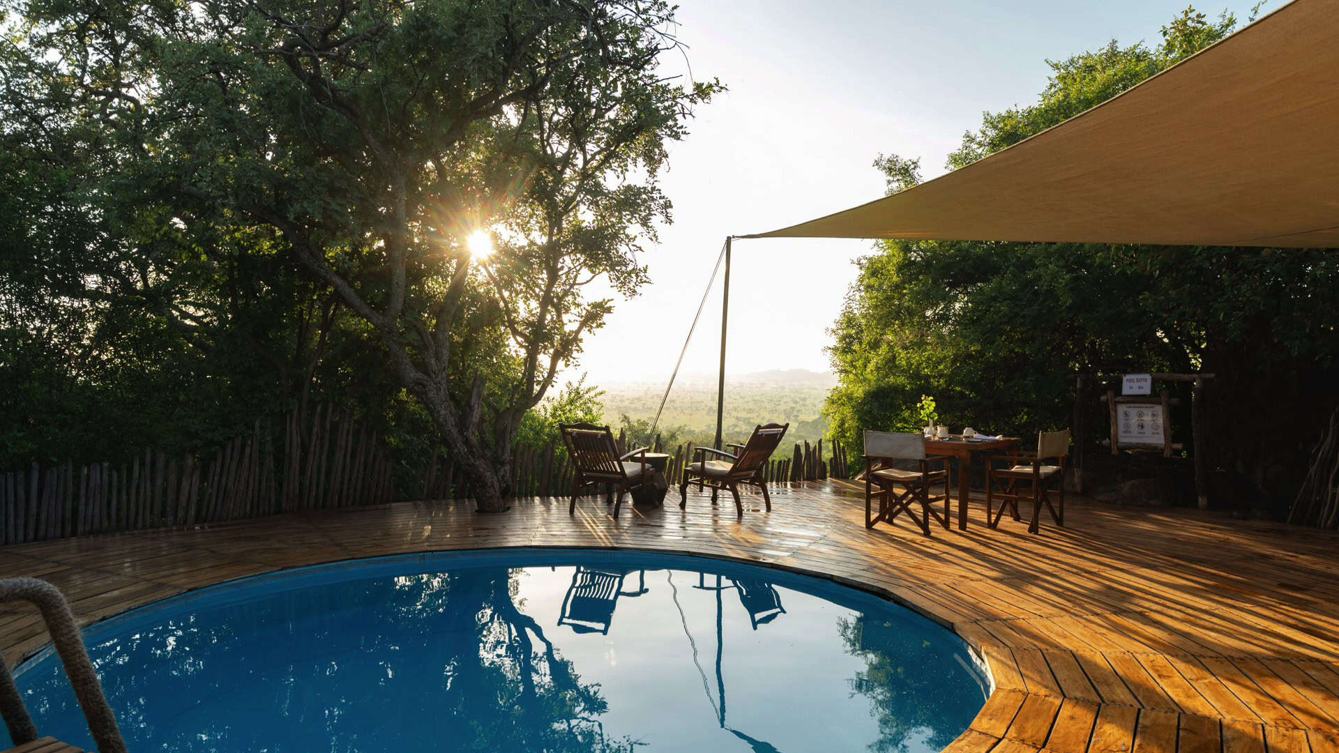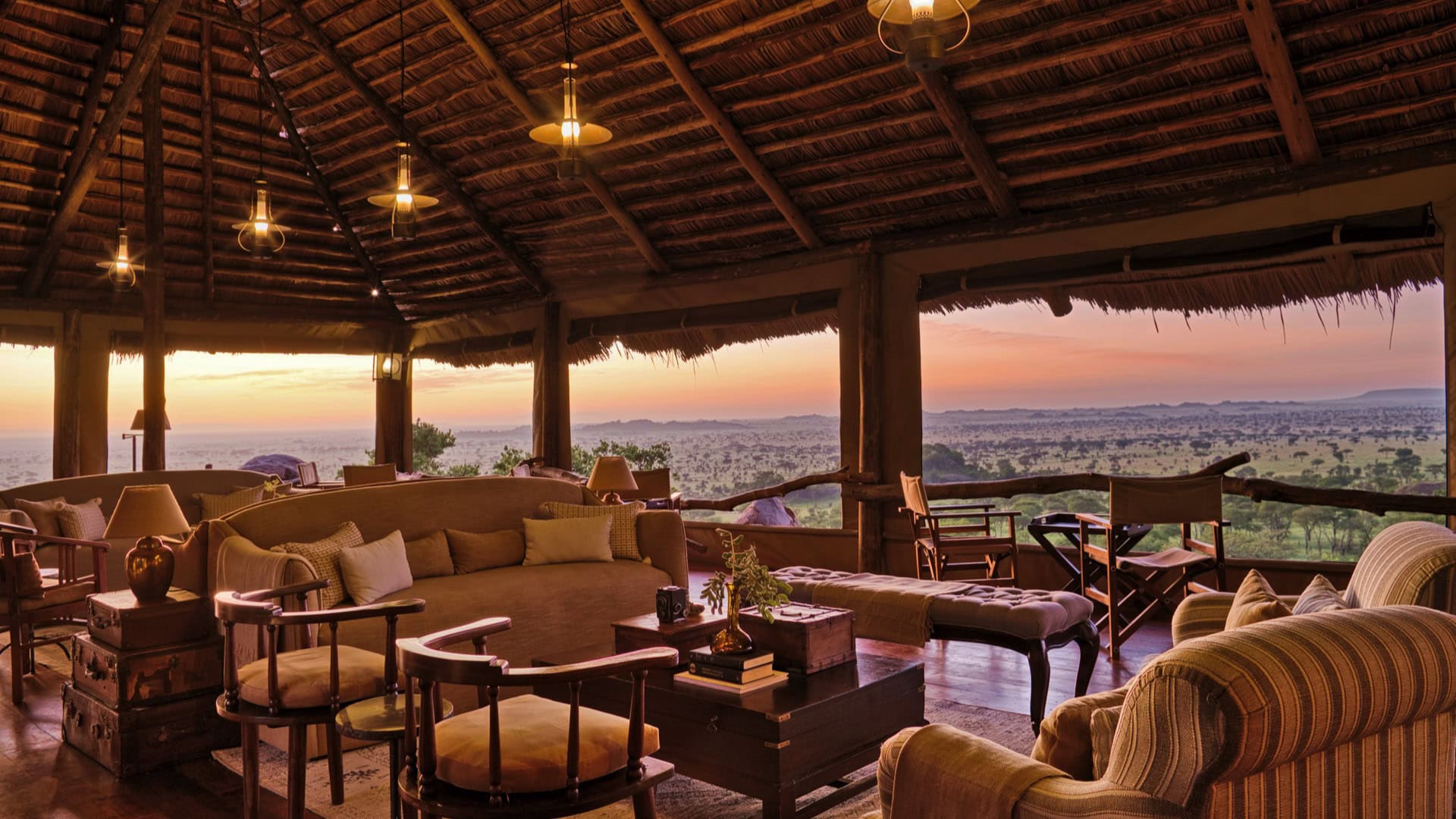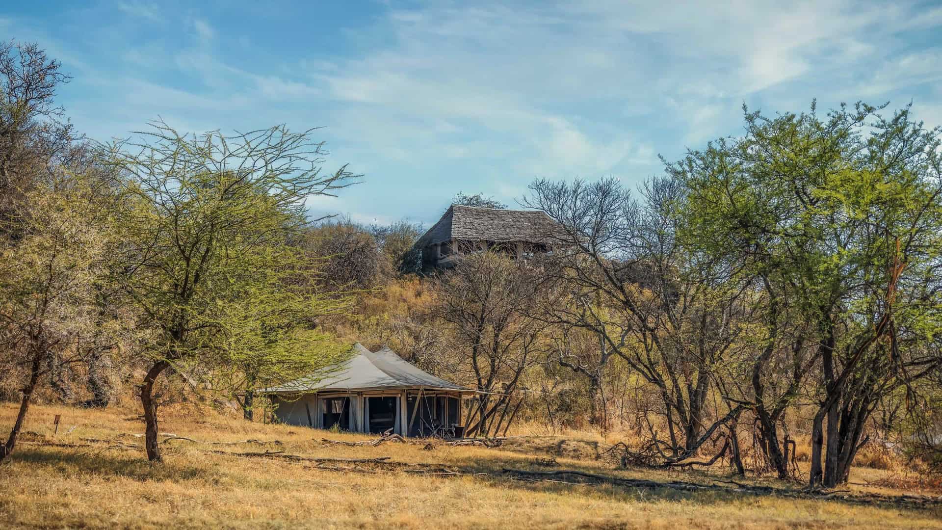 One of the most remarkable features is the lounge with a makuti-thatched roof, perched atop a rocky formation, offering panoramic views of acacia forests, open plains, and the Moru Kopjes. This is the perfect spot to relax and observe the local wildlife, including colorful agama lizards and rock hyraxes.
